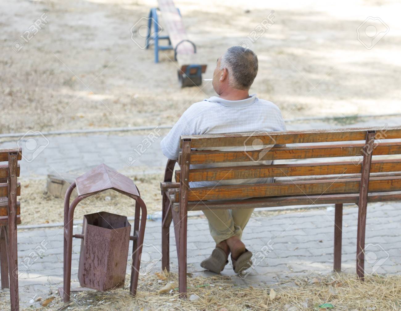 Man Is Sitting Behind His Back On A Bench And Smokes Stock Photo